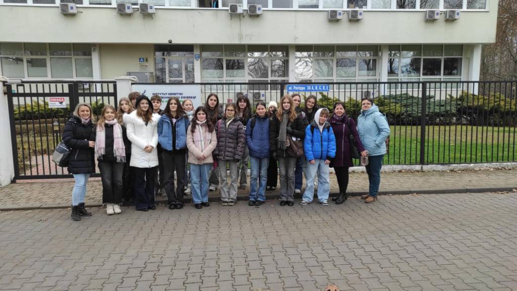 Dnia 18 listopada 2025 roku grupa ośmiu uczniów klas siódmych wraz z dziesięcioosobową grupą kolegów ze Słowacji, goszczących w naszej szkole w ramach projektu Erasmus+, wyruszyła na niezwykłą wyprawę do Instytutu Genetyki i Biotechnologii PAN w Jastrzębcu. Podczas dwugodzinnych zajęć uczestnicy mieli okazję obejrzeć inspirujący film, który przybliżył misję Instytutu oraz jego imponujące osiągnięcia w świecie nauki – zarówno w Polsce, jak i na arenie międzynarodowej.